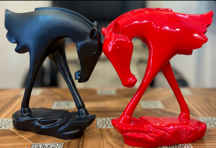 • Sets-275 eachShort Description: “Unleash a wave of raw energy and bold color into your space with this stunning pair of abstract horse sculptures. The fiery red and deep black stallions are captured in a moment of intense connection, their fluid forms radiating power and passion. This dynamic duo is a perfect statement piece for a modern living room or a creative workspace.”