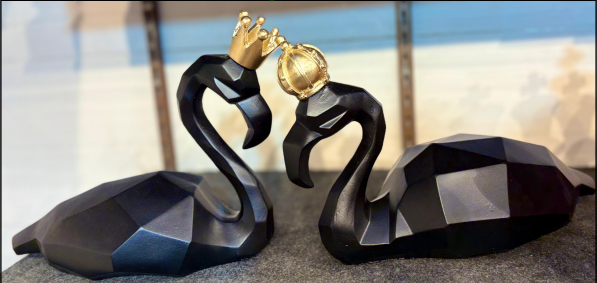 Short Description: “A stunning symbol of modern love and royalty, this pair of geometric swans (or flamingos) is designed to captivate. Finished in a sleek matte black with sharp, faceted lines, each bird is crowned with a brilliant golden crown. Their loving pose, forming a heart as they kiss, makes them a perfect centerpiece for a contemporary home or a sophisticated wedding gift.