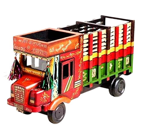 Celebrate the vibrant culture of Indian highways with this dazzling hand-painted wooden miniature truck, inspired by the famous “Truck Art” found across the subcontinent. This highly decorative piece features bold, eye-catching colors like bright red, green, and yellow, completely covered in traditional geometric and floral patterns, along with characteristic Hindi and English slogans and phrases.