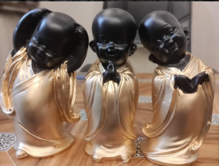 - Description: Bring a wave of peace, joy, and mindfulness into your home with this adorable set of three little monk figurines. Each monk strikes a playful and serene pose, reminding us to live with happiness and a light heart. Available in a classic black & gold or a vibrant multi-color finish, they are a perfect addition to your desk, car dashboard, or any corner that needs a touch of positive energy.